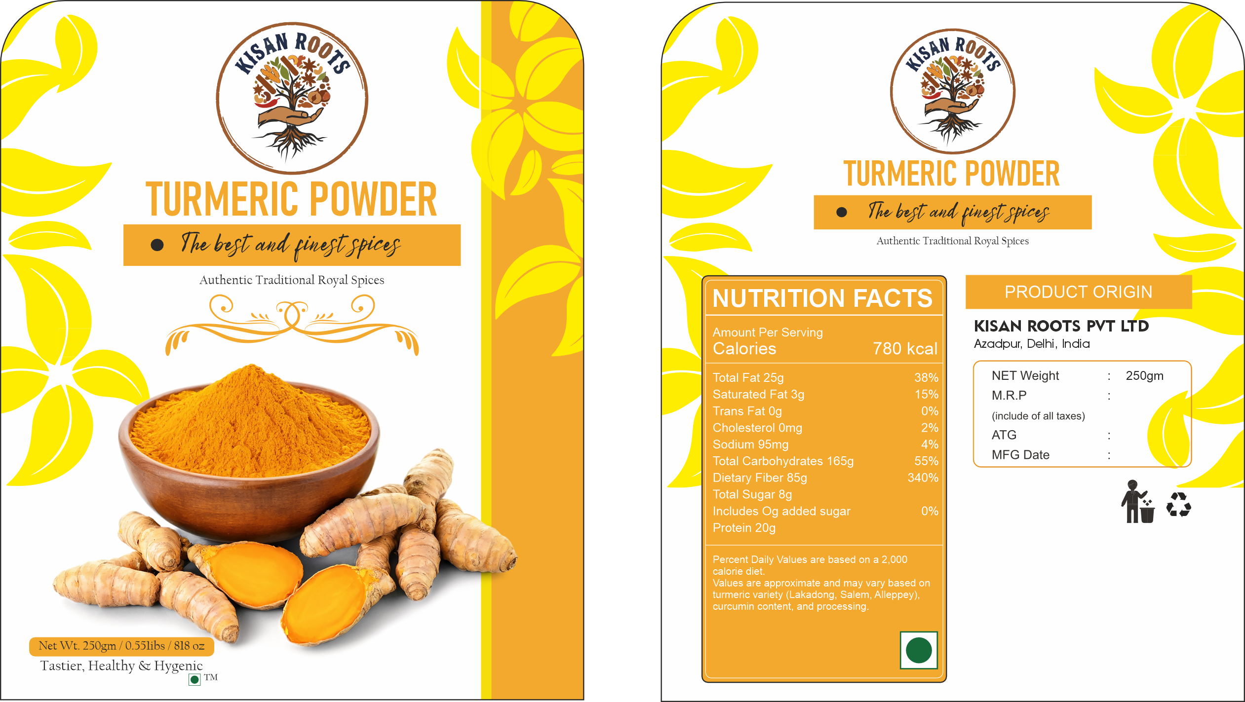 Turmeric Powder is one of the staple spice blends in Indian recipes. It is a spice enriched with strong flavour and healing properties, having a curcumin percentage of up to 3%, that gives a distinct flavour and colour to all your dry and curry-based preparations.